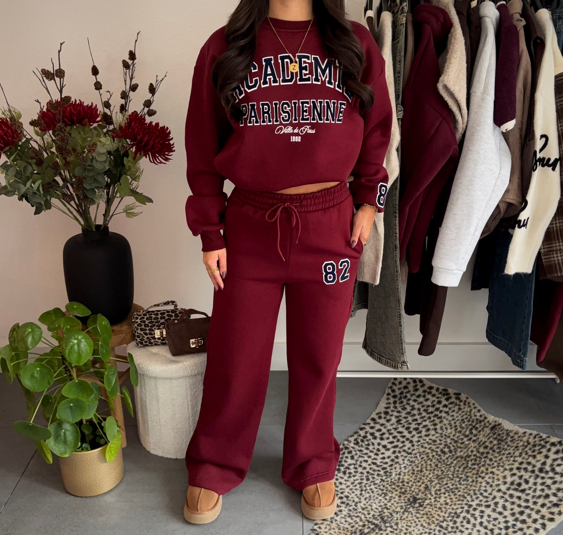 Ga voor een stijlvolle, relaxte look met onze “Académie parisienne” joggingset. Deze matching set bestaat uit een zachte, oversized sweatshirt en een comfortabele jogger met elastische taille en rechte pijpen. De diepe bordeauxrode kleur in combinatie met de contrasterende witte en navy opdruk geeft een sportieve, Parisian-chic uitstraling.