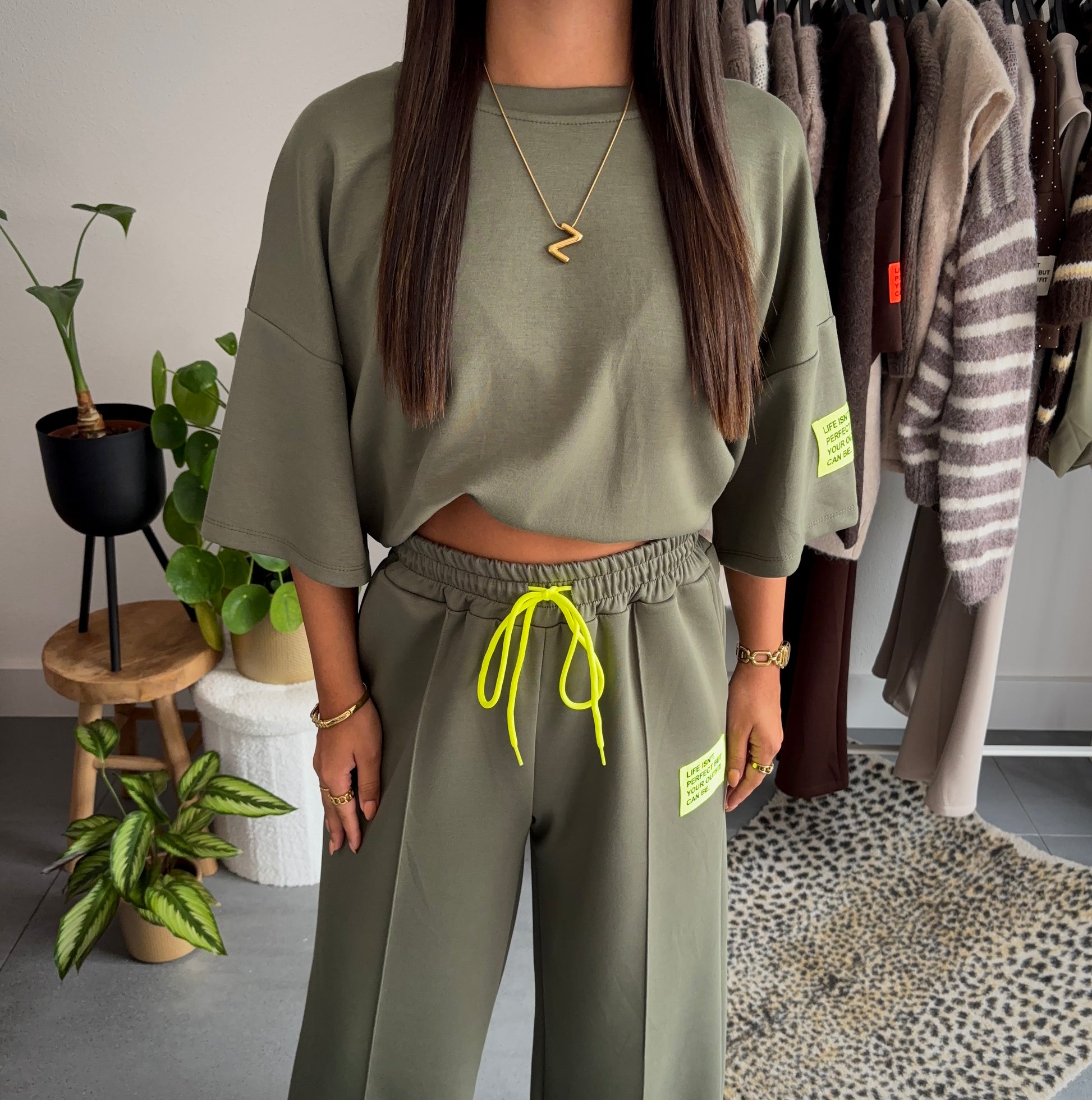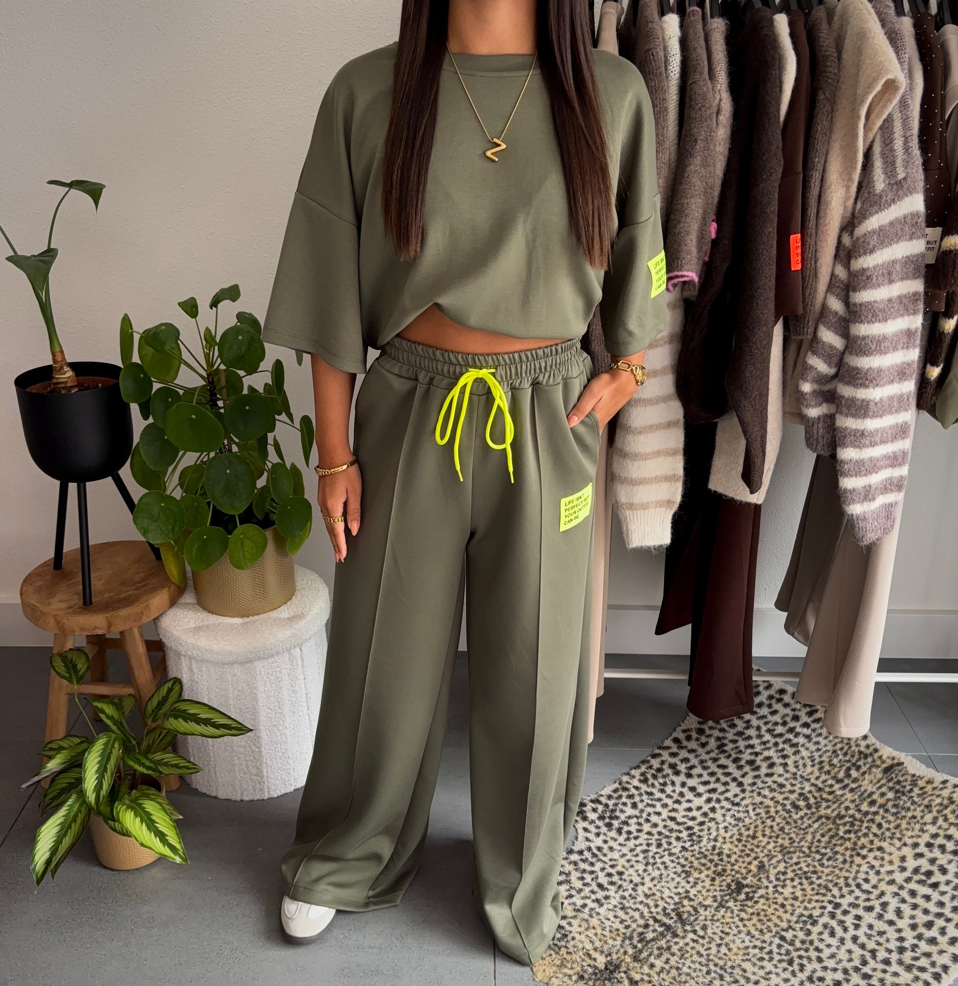 Onze "Bold contrast set"! Deze stoere, tweedelige set bestaat uit een oversized T-shirt en bijpassende broek met een elastische tailleband. Wat deze set écht uniek maakt? Het opvallende neonoranje detail: een felgekleurde drawstring en patch die een sporty vibe geven en jouw look direct naar een hoger level tillen.