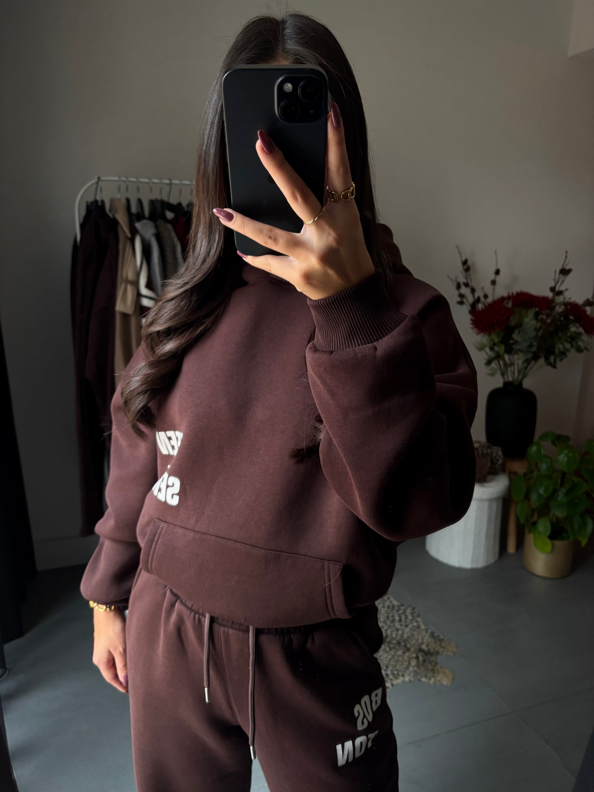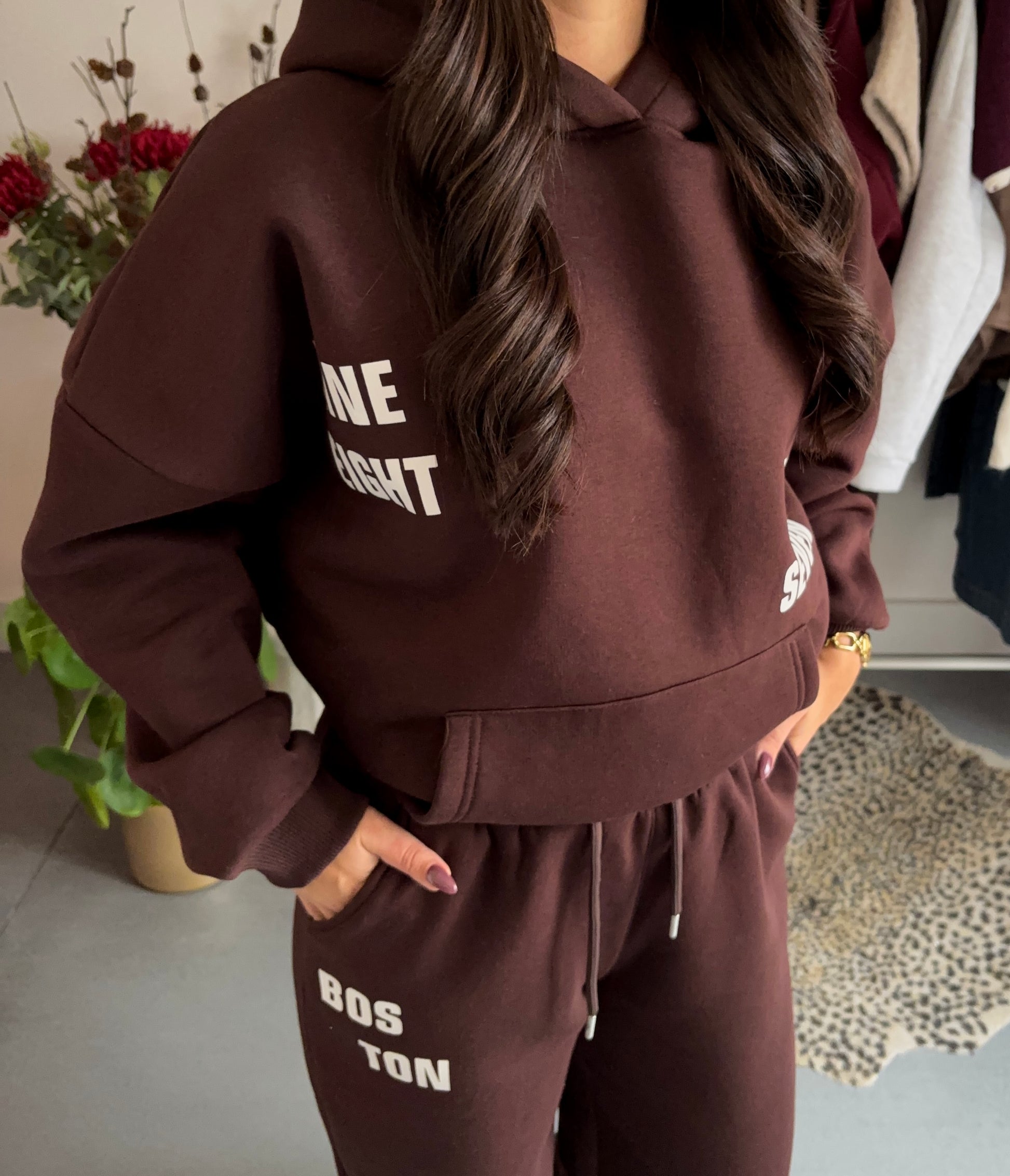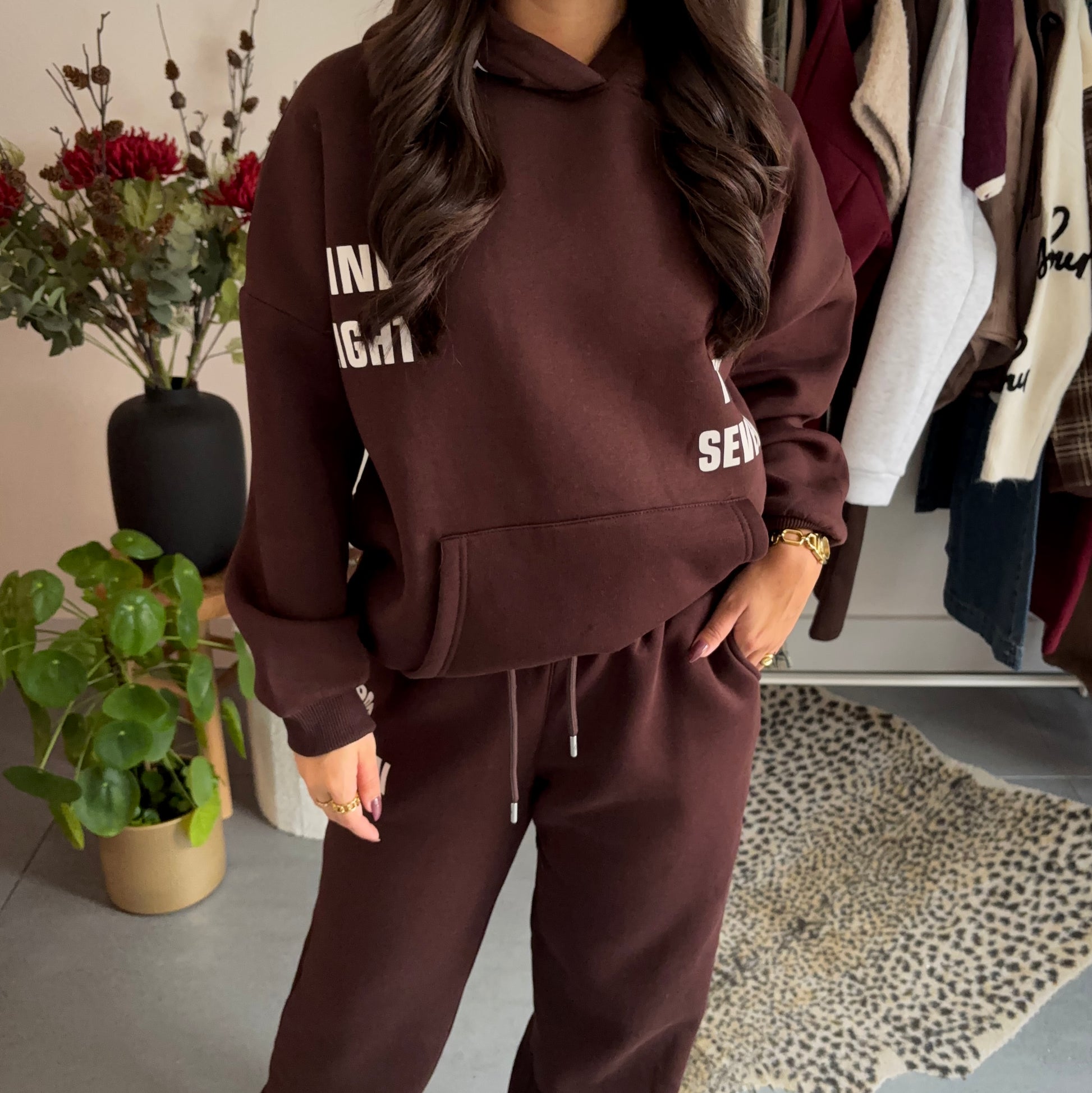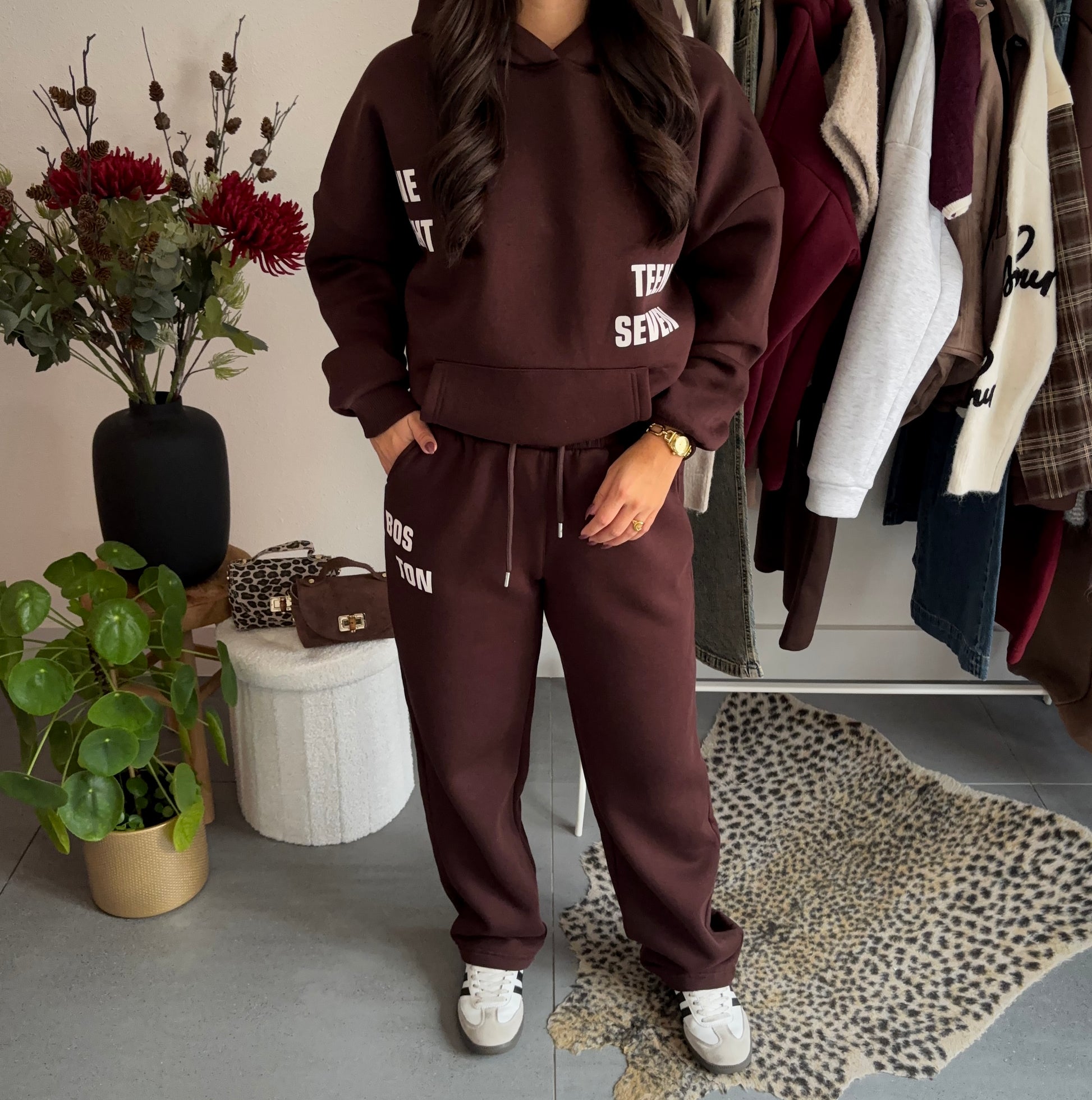 De “Boston seventeen joggingset” brengt sportieve vintage vibes samen met ultiem comfort. Deze matching hoodie en jogger zijn uitgevoerd in een diepe chocoladebruine tint, dé trendkleur van het seizoen. De witte varsity-style prints voegen een subtiele, old-school touch toe, perfect voor een effortless streetstyle look.