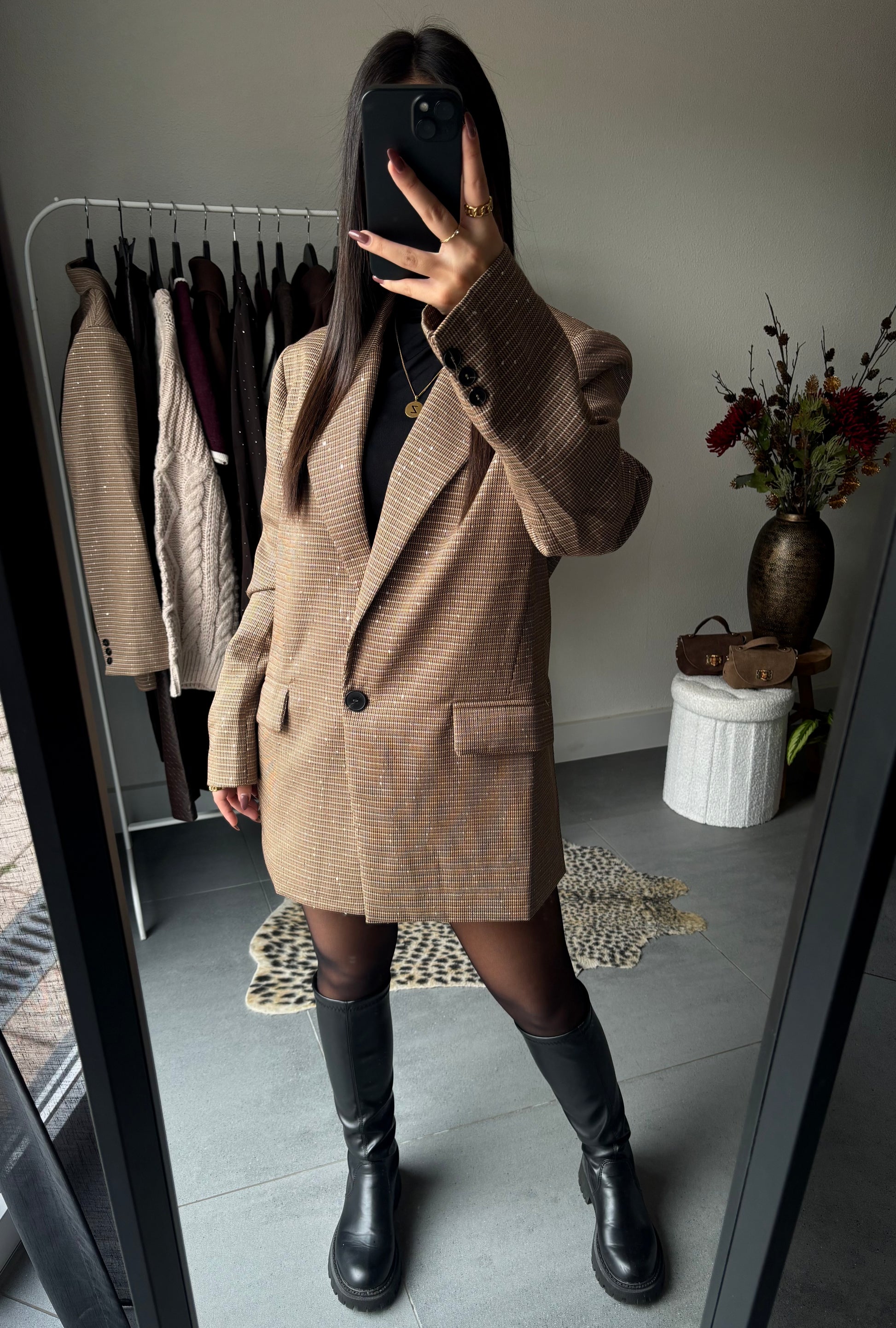 De “Cambridge check oversized blazer” is een stijlvol statement piece dat perfect balanceert tussen classy en edgy. Deze blazer, uitgevoerd in een warme camel-bruin geruite print, heeft een uitgesproken oversized fit waardoor je hem zowel als blazer als mini-jurk kunt dragen.