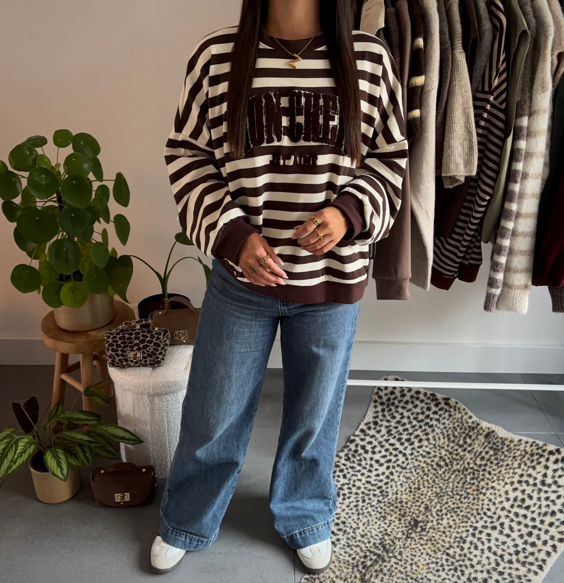 De “Choco stripe varsity sweater” is een sportief én stijlvol item dat je look een nonchalante college-vibe geeft. De brede bruine en crème strepen zorgen voor een tijdloze, casual uitstraling, terwijl de fluweelzachte varsity-letterprint op de borst een speels contrast toevoegt.