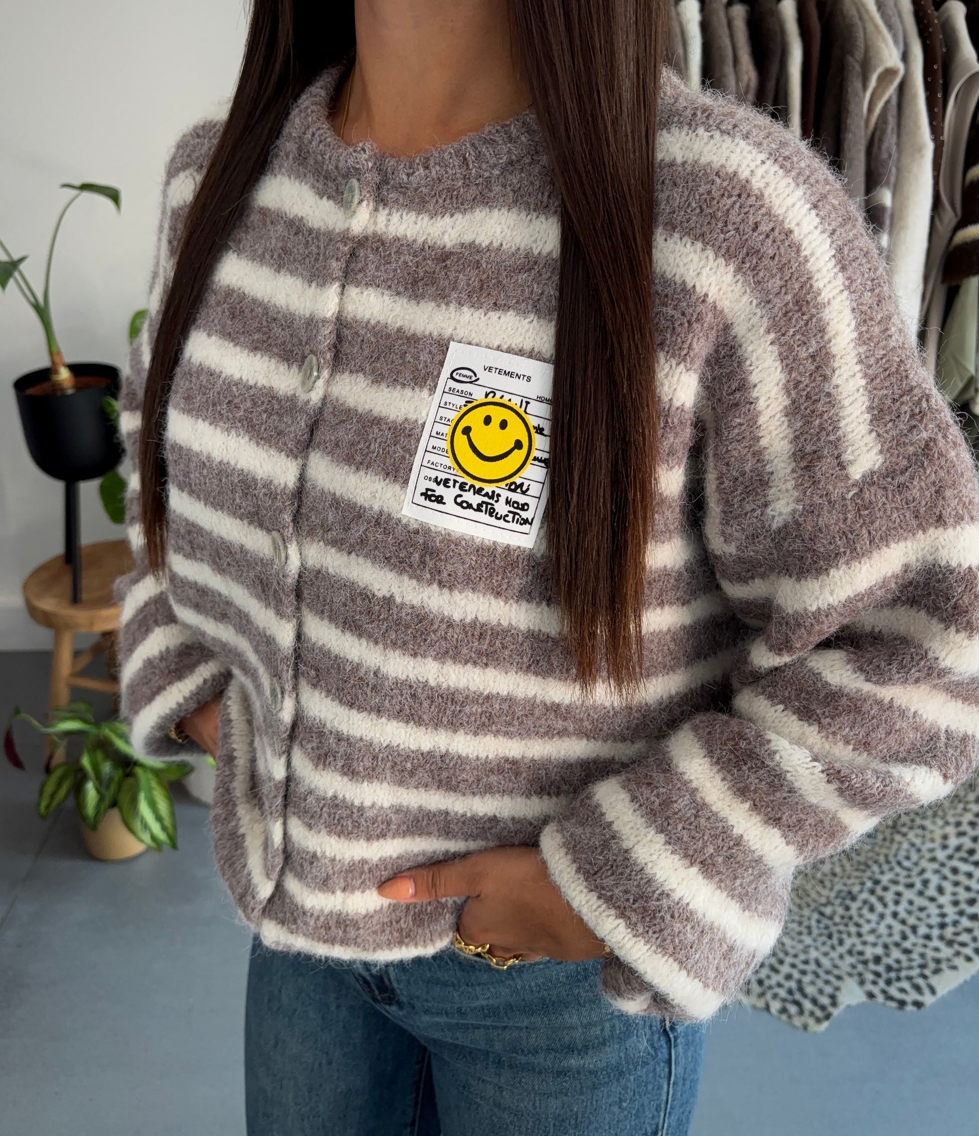 De "Happy stripes cardigan" is een knuffelzachte must-have die direct een glimlach op je gezicht tovert. Met zijn speelse, horizontale strepen en het iconische smiley-patch op de borst straalt dit vest pure positiviteit uit. De licht oversized fit, zachte knoopsluiting en fluffy textuur maken hem perfect voor cosy dagen.