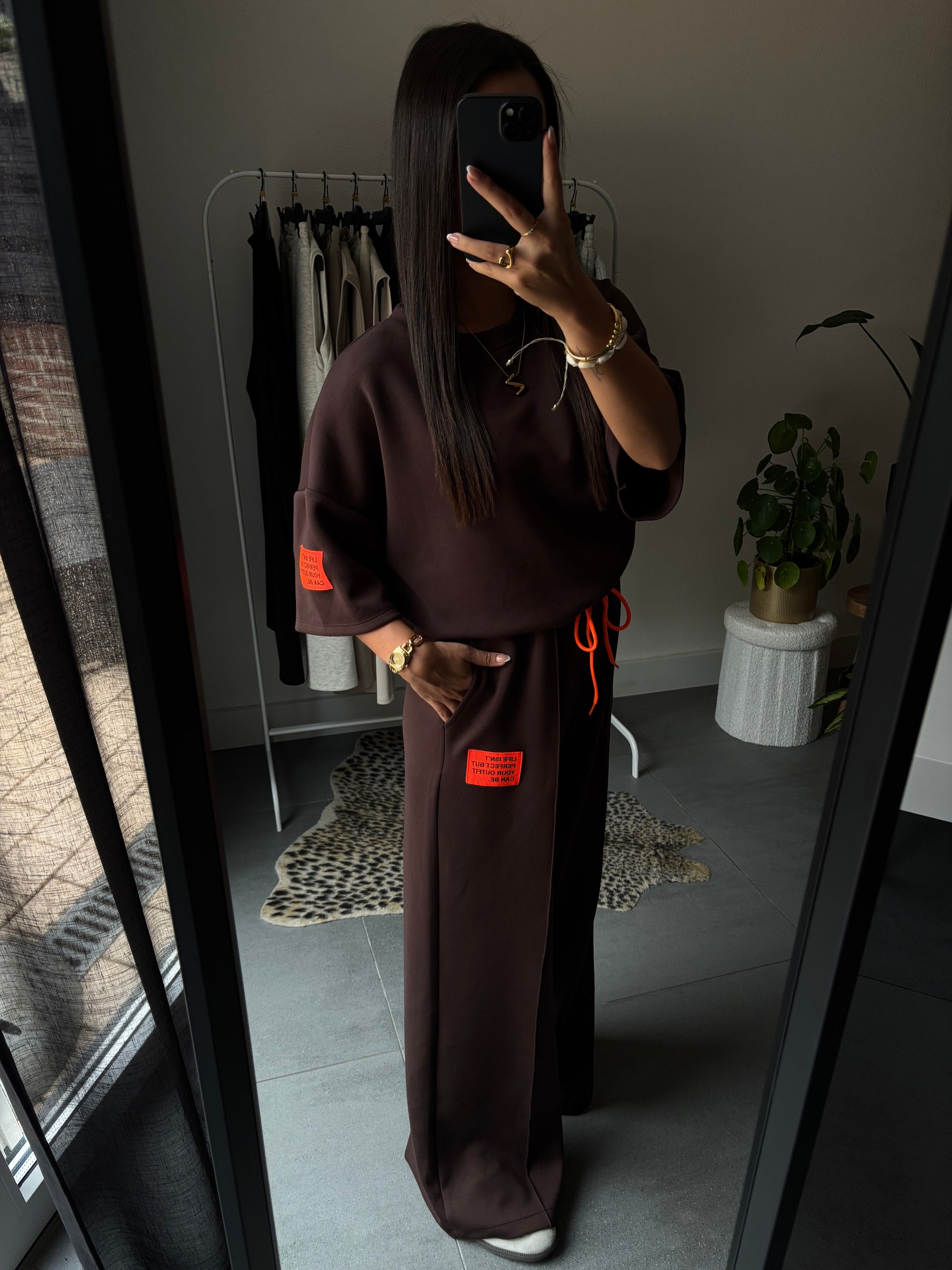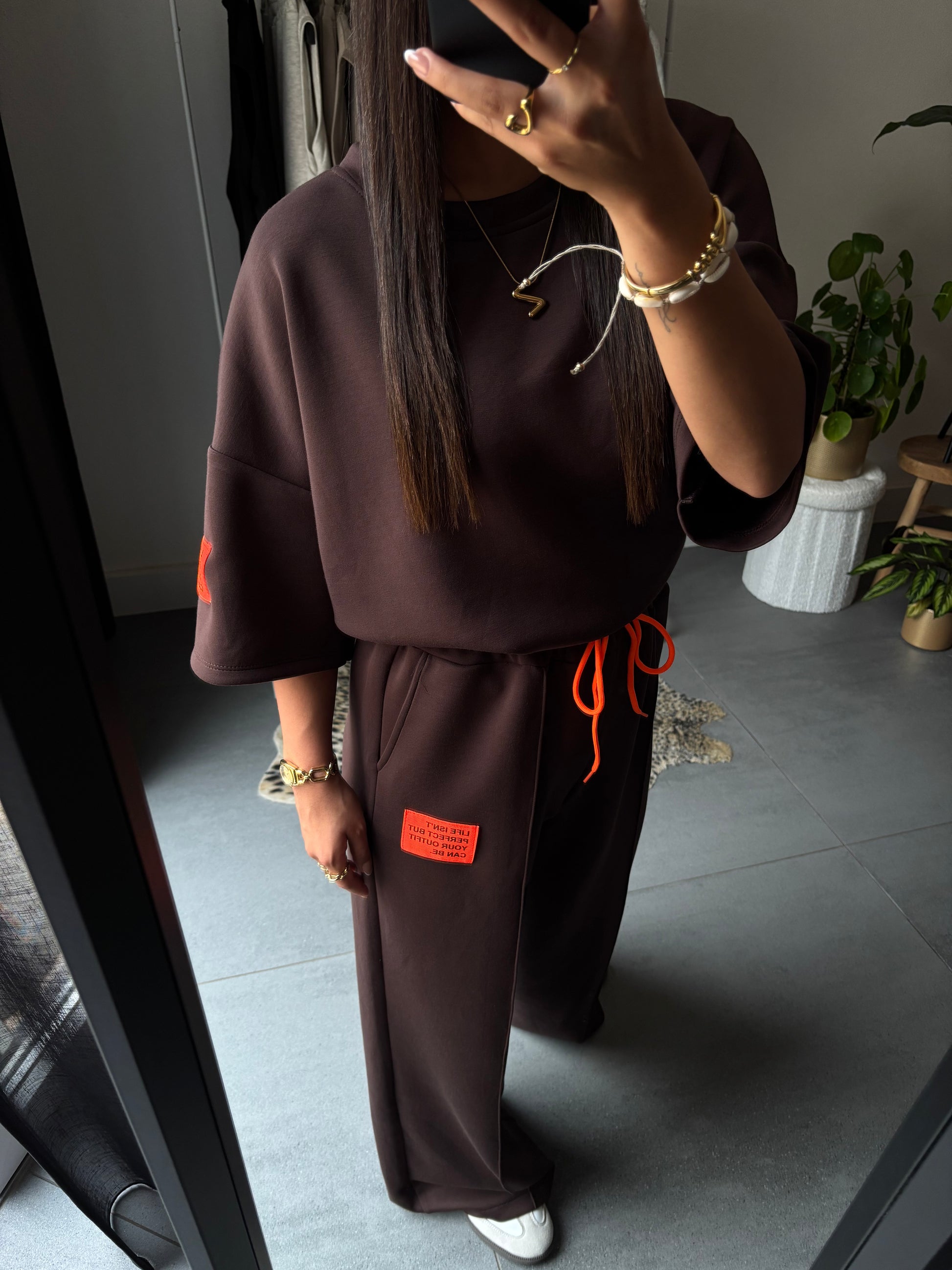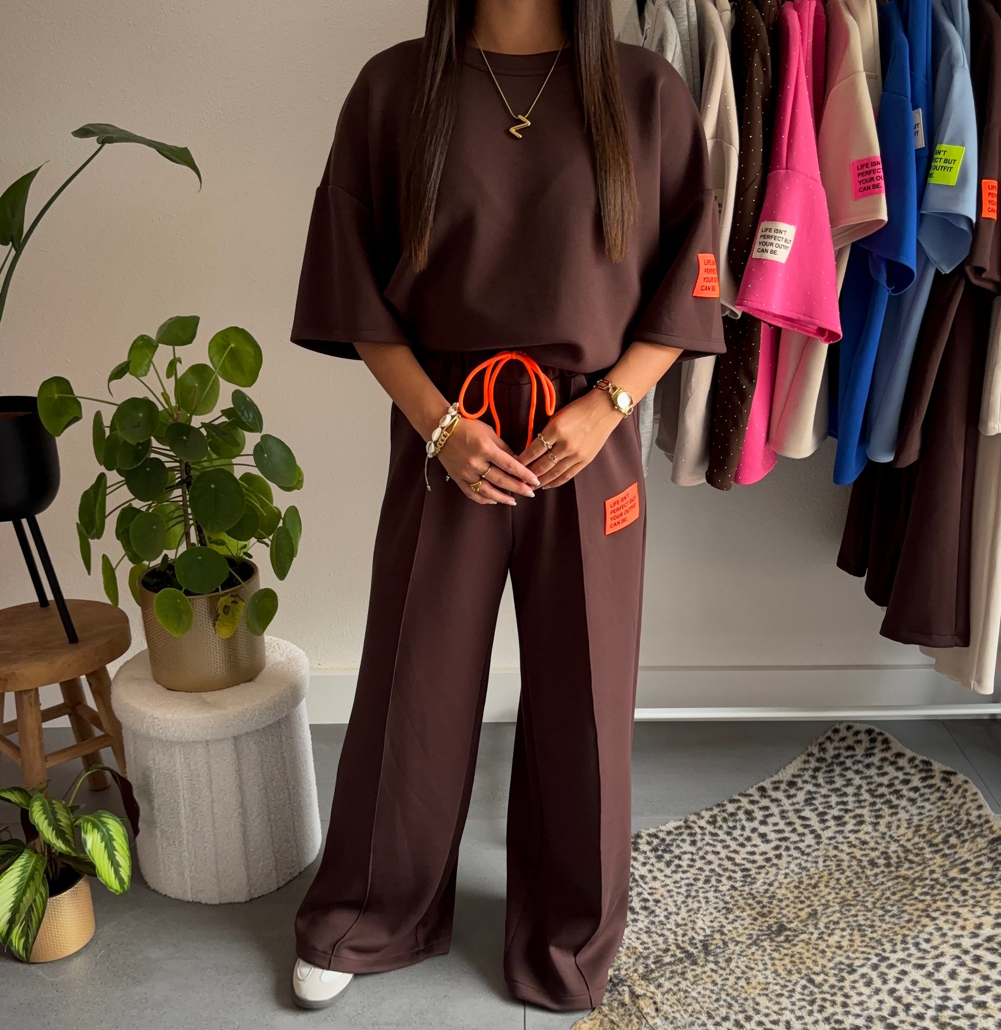 Onze "Bold contrast set"! Deze stoere, tweedelige set bestaat uit een oversized T-shirt en bijpassende broek met een elastische tailleband. Wat deze set écht uniek maakt? Het opvallende neonoranje detail: een felgekleurde drawstring en patch die een sporty vibe geven en jouw look direct naar een hoger level tillen.