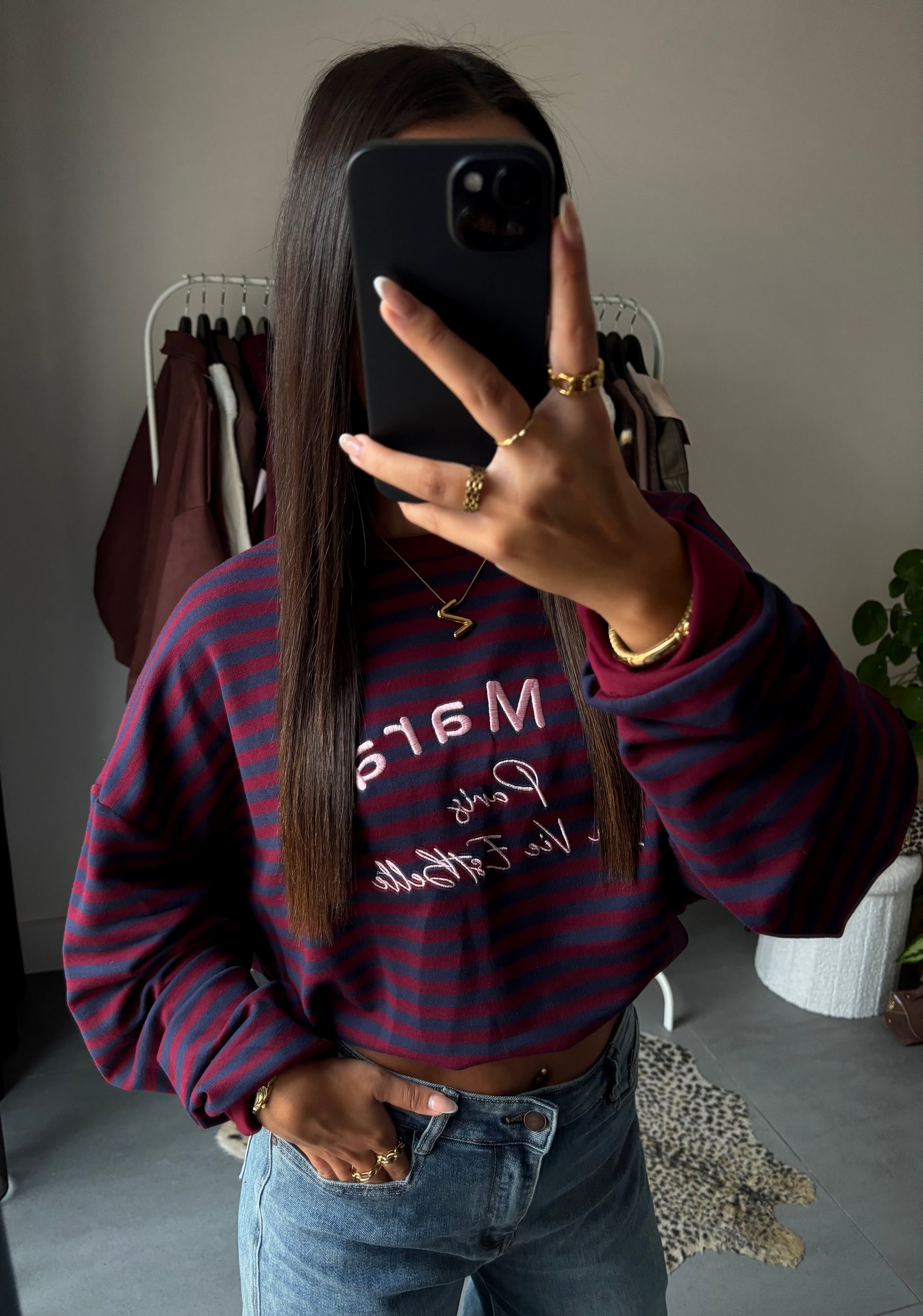 De “Parisienne stripe sweater” brengt een vleugje Franse charme in je garderobe. De diepe bordeauxrode en navy strepen geven een tijdloze en stijlvolle uitstraling, terwijl de witte geborduurde tekst “Le Marais – Paris, La Vie Est Belle” zorgt voor een speels en chic detail.