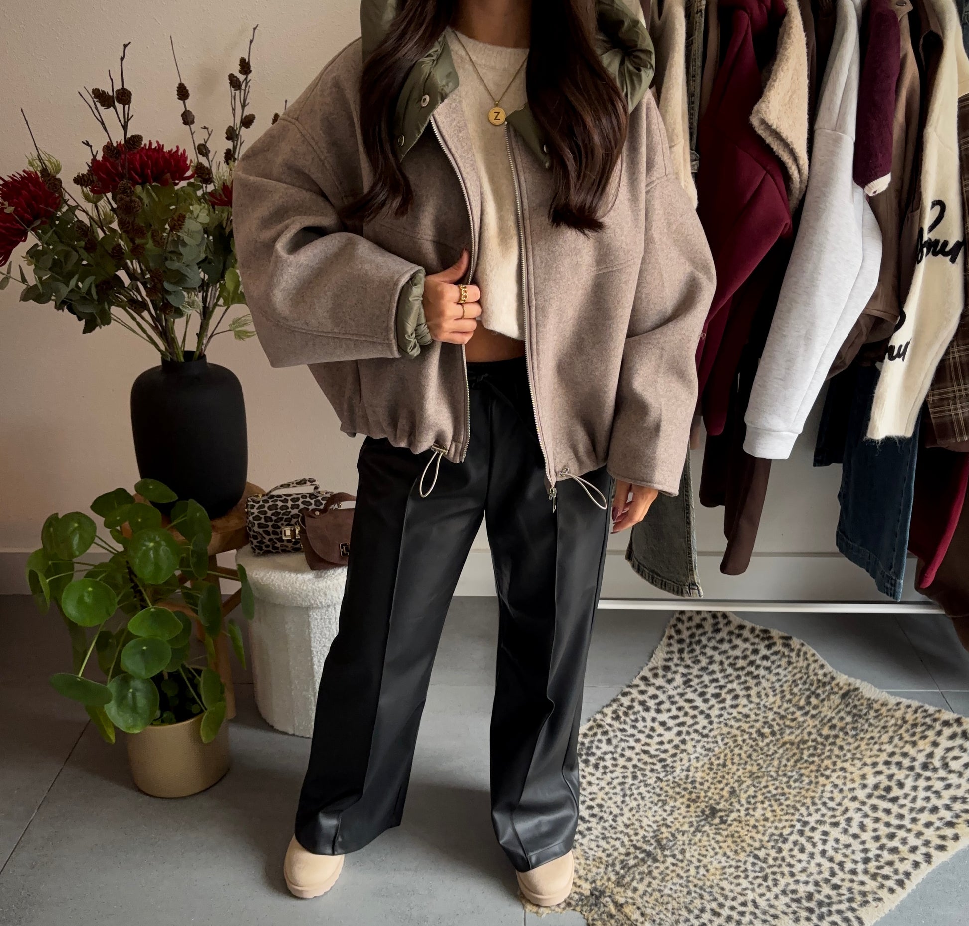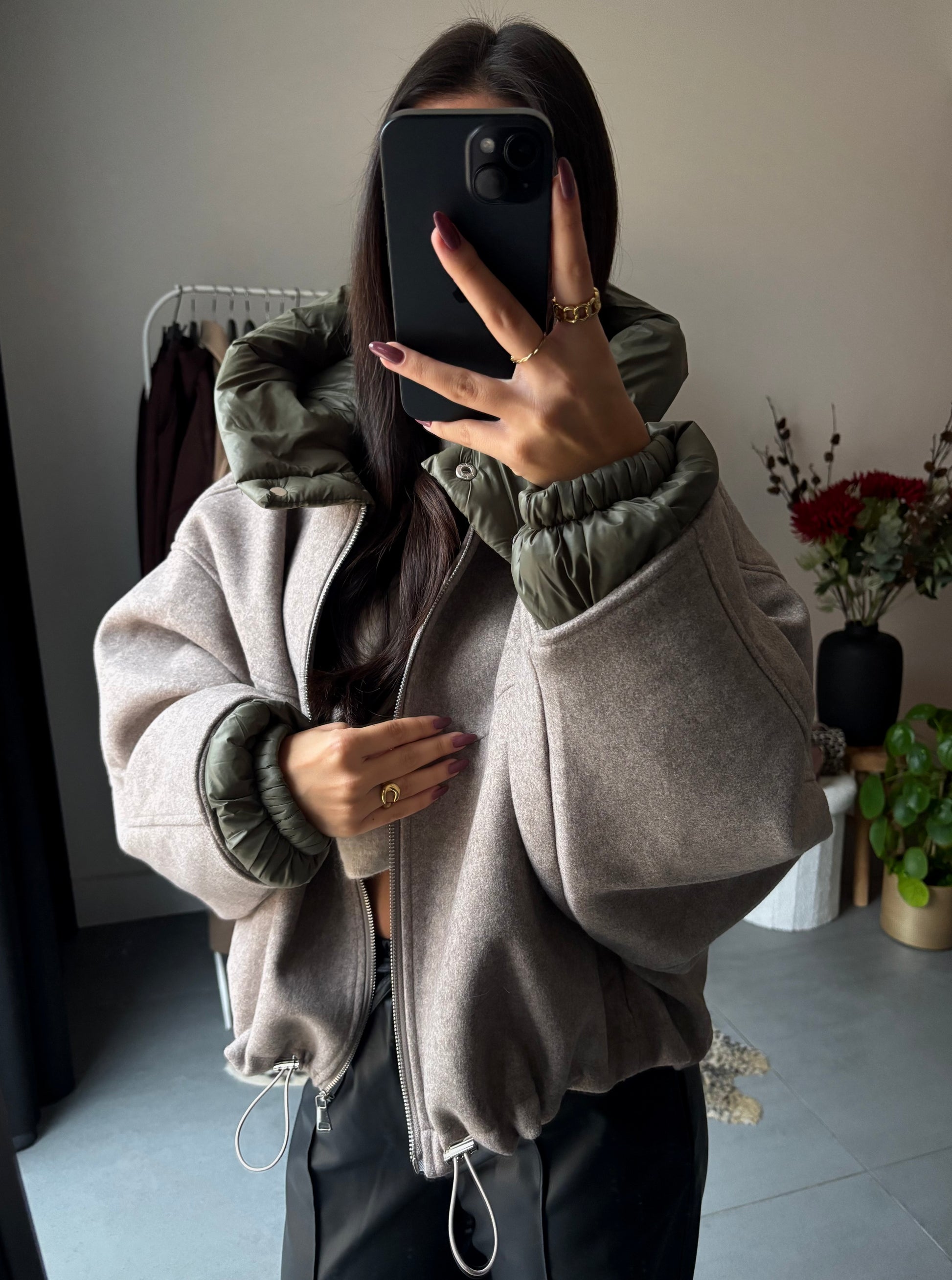 De “Reversible utility bomber jacket” is dé jas die met je look meebeweegt. Deze oversized jas in taupe heeft een afneembare khaki gewatteerde binnenlaag en capuchon, perfect om te switchen tussen een minimalistische wool look en een sportieve puffer vibe. De relaxte fit, verstelbare trekkoorden en stevige ritssluiting maken het een veelzijdige must-have voor het najaar.