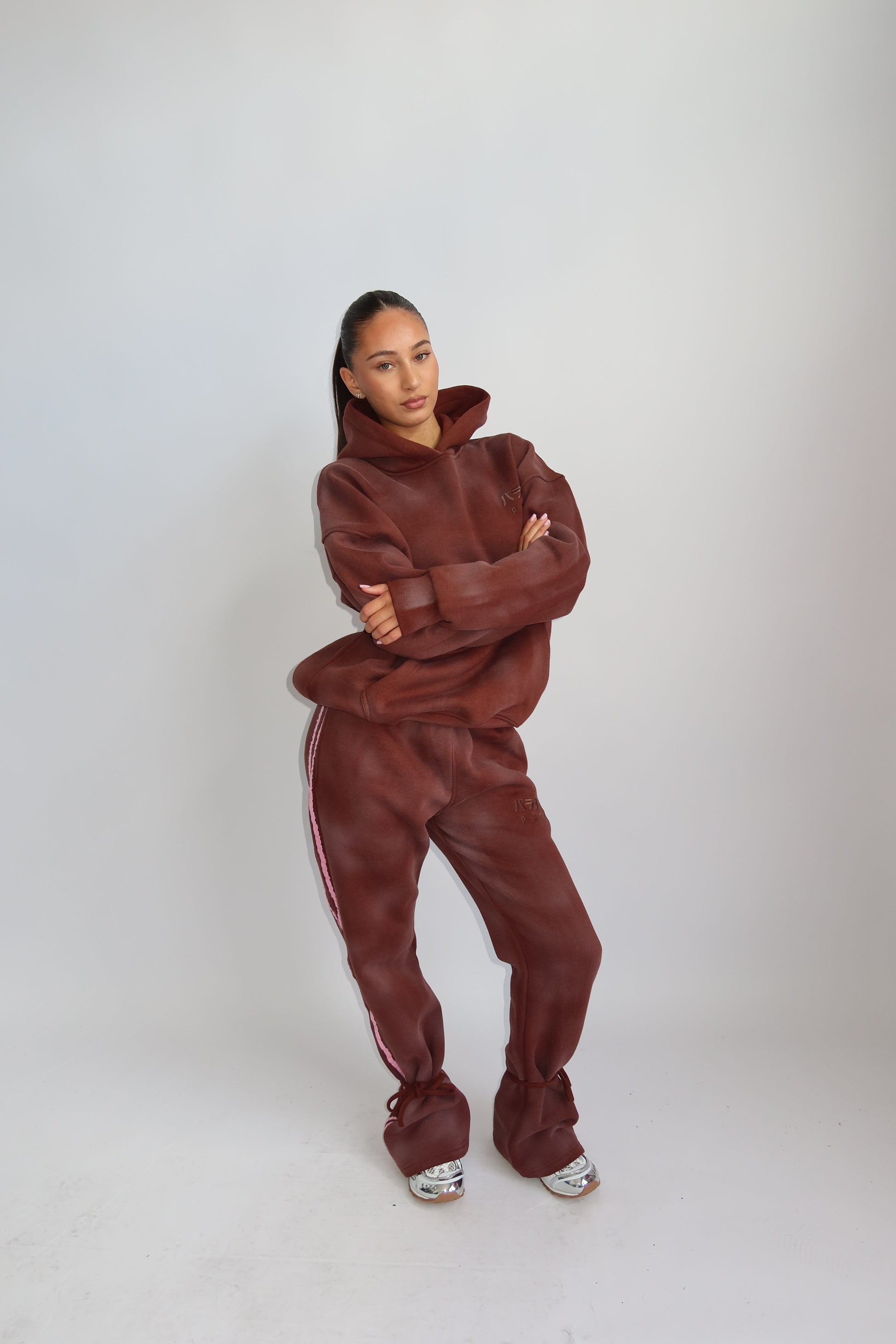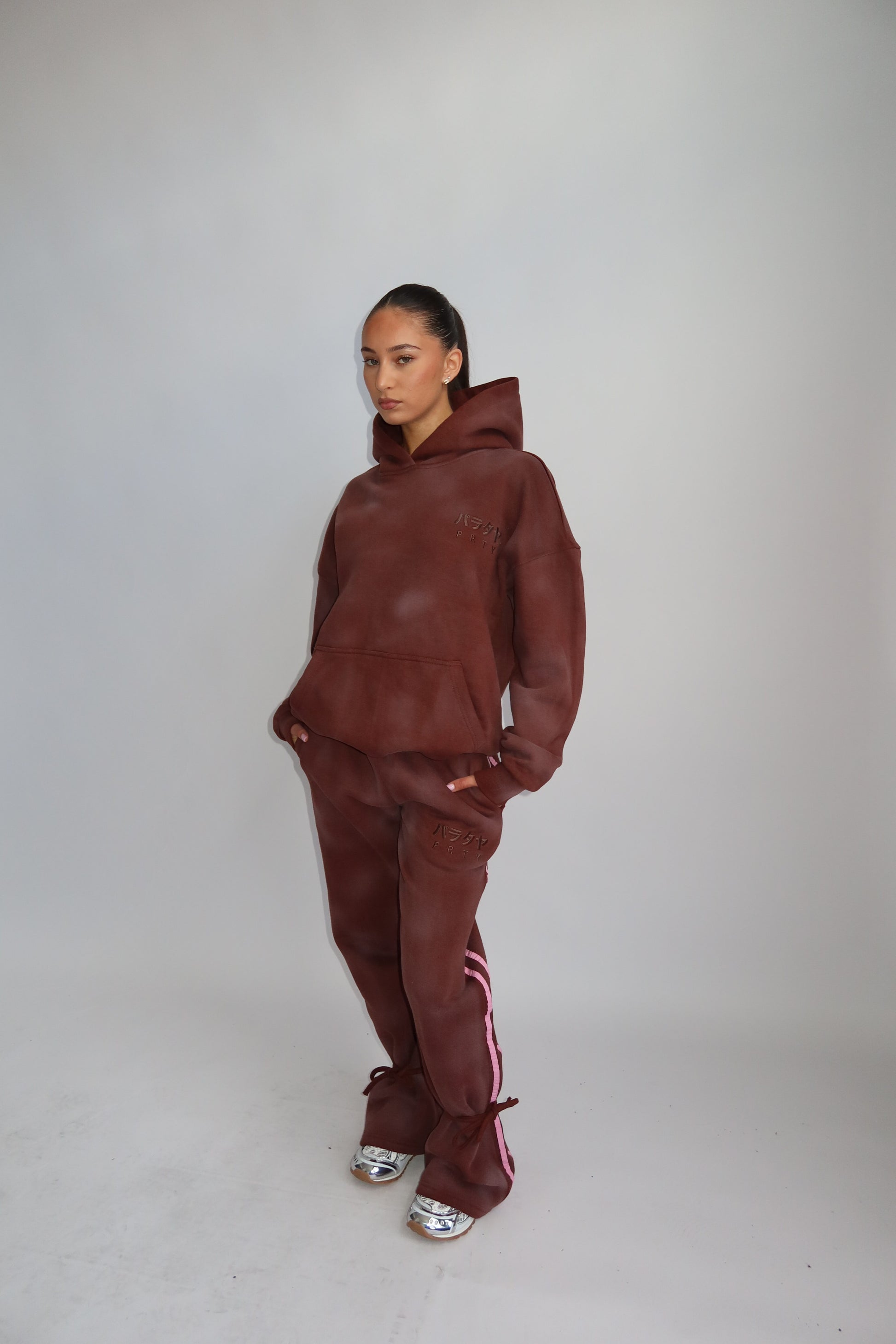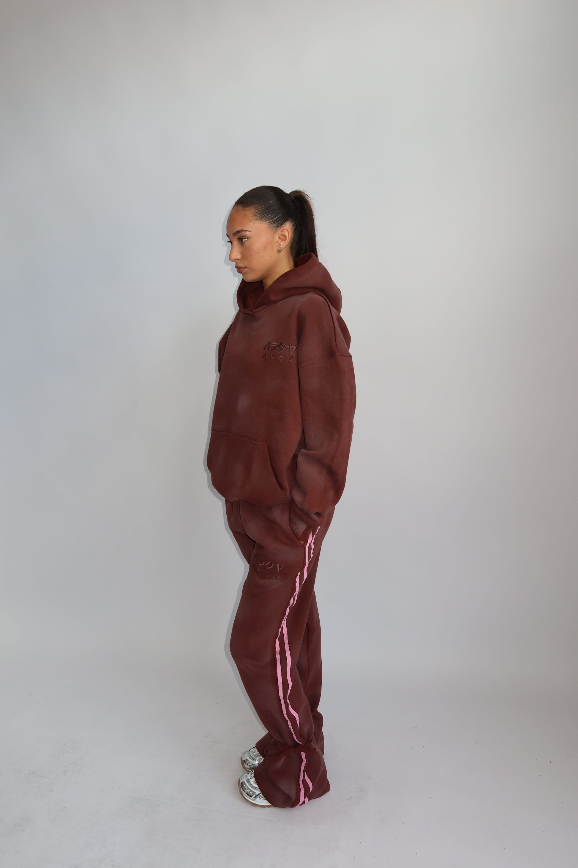 De “Kyoto fade lounge set” is een moderne en supercomfy loungewear set met een unieke, subtiele washed finish. De diepe roodbruine kleur krijgt dankzij het faded effect een stoere, streetstyle uitstraling, terwijl de minimalistische Japanse lettering op zowel de hoodie als de broek zorgt voor een krachtige, urban touch.